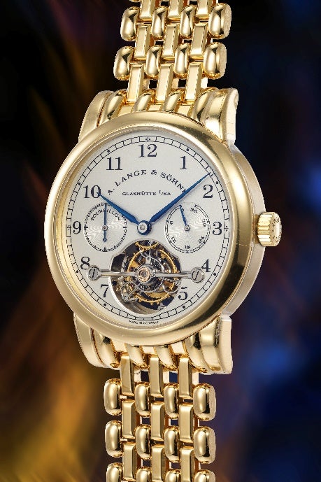 While the Lange 1 is arguably the most distinctive timepiece by A. Lange & Söhne, the Tourbillon Pour le Mérite, named after one of Germany’s highest orders of merit, is a true tour de force of mechanical watchmaking. Taking the tourbillon to new heights, the Pour le Mérite was the first wristwatch to feature the fusée-and-chain transmission, a refined constant-force mechanism that was developed with Renaud & Papi. The original Pour le Mérite was made in a production run of only 200 pieces, with 106 of that total in 18k yellow gold, such as the present example. This example is also paired with an original 18k yellow gold Wellendorff bracelet, which is confirmed to have been delivered with the watch in 1994.
