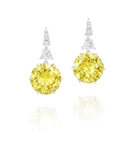 A Pair of 9.69- and 9.71-carat Fancy Intense Yellow Diamond and Diamond Earrings