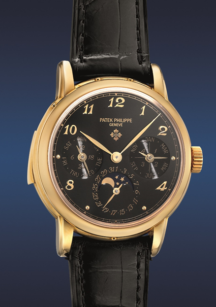 Leading the sale is a possibly unique Patek Philippe Ref. 3974 in a yellow gold case made by the legendary casemaker Jean-Pierre Hagmann (illustrated page 1). The Ref. 3974 was launched in 1989 to celebrate the brand's 150th anniversary. A self-winding watch featuring a minute repeater, a perpetual calendar, 24-hour indication and phases of the moon, it was the world’s most complicated wristwatch when launched. One of the earliest produced, this truly stellar example features a striking black lacquer dial embellished with the prestigious symbol of excellence, the Calatrava Cross. Other details that show extensive customisation by Patek Philippe including the italicised font used for the calendar indications, and the applied gold Breguet numerals that are always a rare and desirable configuration for complicated Patek Philippe wristwatches matching beautifully with the hue of the case.