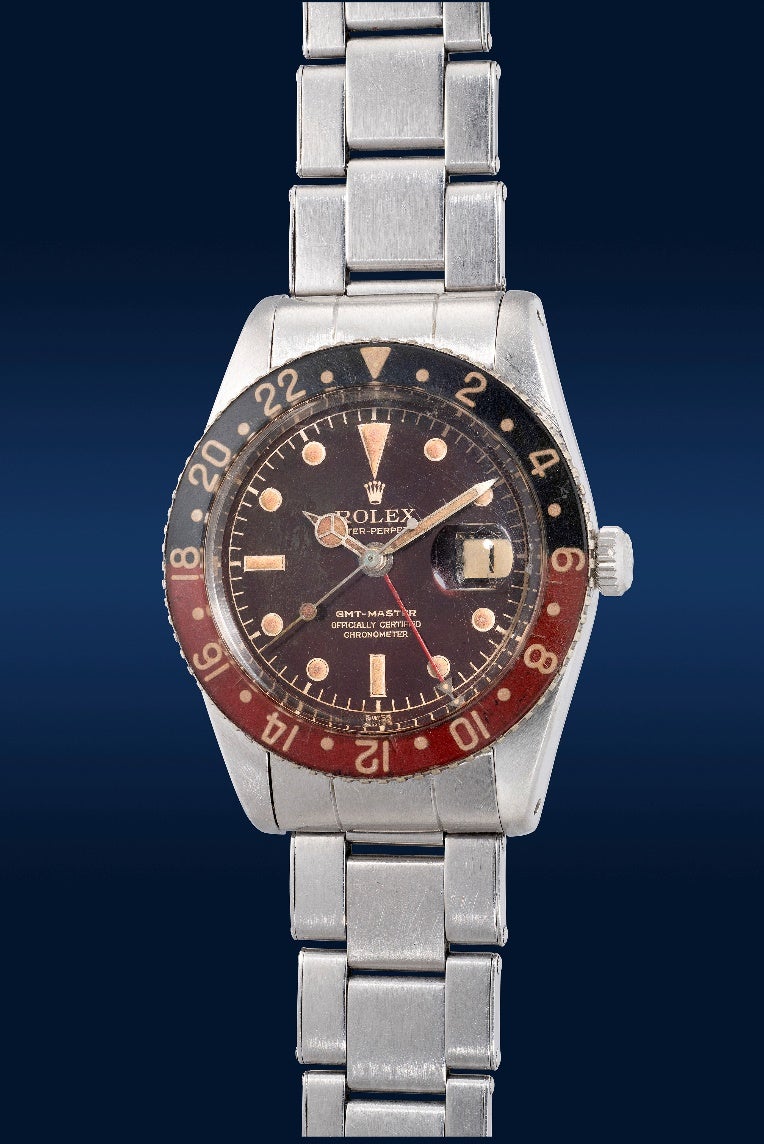 Instantly recognizable by its red and blue Bakelite bezel, with radium filled twenty-four-hour numerals painted on the underside, Rolex’s ref. 6542 was designed to make sure that the viewer can track a second time zone under any weather conditions. The ref. 6542 was in production for only 4 years from 1955, adding to its exclusivity and rarity.