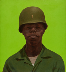 Painted 1968, Barkley L. Hendricks’s FTA is a definitive early example of the artist’s celebrated singular portrait aesthetic that would go on to define his output in the 1970s. A vibrant green monochromatic ground acts as the backdrop for his bust portrait of a U.S. Army soldier dressed in a military green, Vietnam-era uniform, who Hendricks positions as a Lieutenant—a position hardly offered to African American soldiers at the time. “FTA” was a common troop expression subverting the army’s slogan of “Fun, Travel and Adventure,” which later became adopted by vocal anti-war activists who imbued it with new meaning — "Fuck the Army." The work hails from a distinguished New England collection and is being sold publicly for the first time to benefit the pursuit of anti-racism.