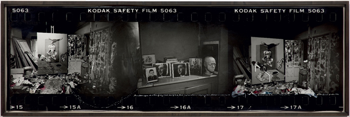 Epic in scale and masterful in execution, Peter Beard’s unique study of the interior of Francis Bacon’s London studio documents the creation of one of Bacon’s masterpieces and illuminates the deep friendship between the two artists. Beard’s panoramic image consists of three consecutive exposures on a strip of enlarged 35mm film and captures the central panel of Bacon’s lauded Triptych, 1976. Taken as a whole, Beard’s multi-panel photograph is a meditation on the passage of time and the inevitability of death, as well as on the potential of the artistic process to overcome mortality.