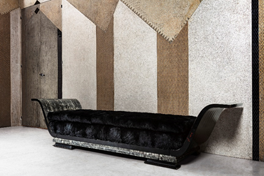 Composed of lacquered panels with integrated lacquered and engraved metal plates, ‘Les Palmiers’ smoking room features an interplay of tones and textures that demonstrates Dunand’s mastery of the ancient technique of lacquer. The resulting surface effects and the graphic use of line to depict a forest of stylised palm trees evoke an exotic scene through abstract simplicity, emblematic of the French Art Deco movement. The work is signed by Dunand and was furnished with black lacquered and tinted shagreen designs by Hamanaka, including the present daybed.