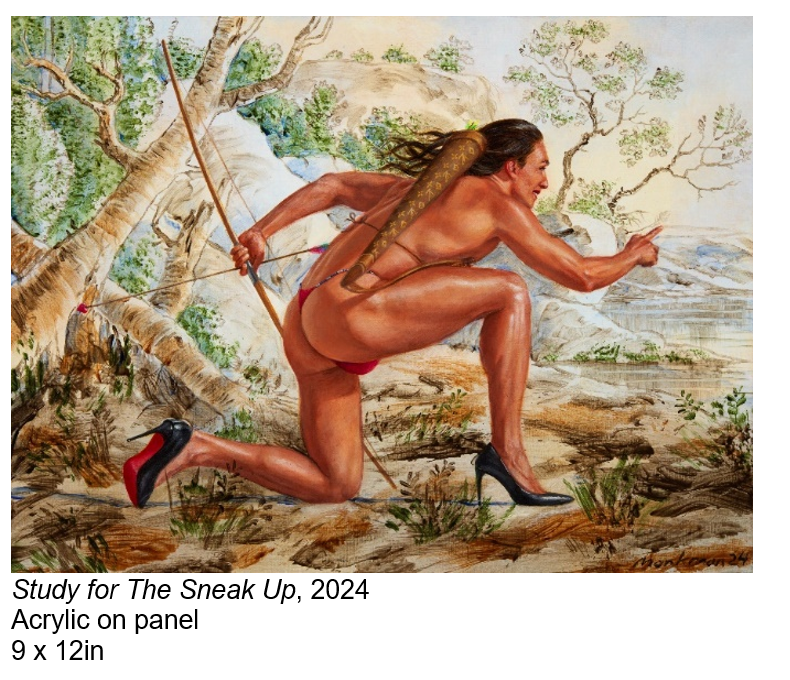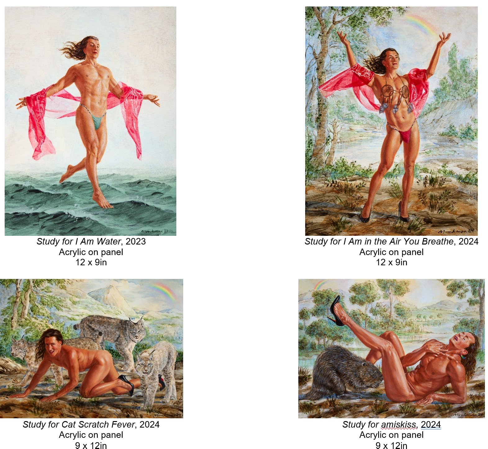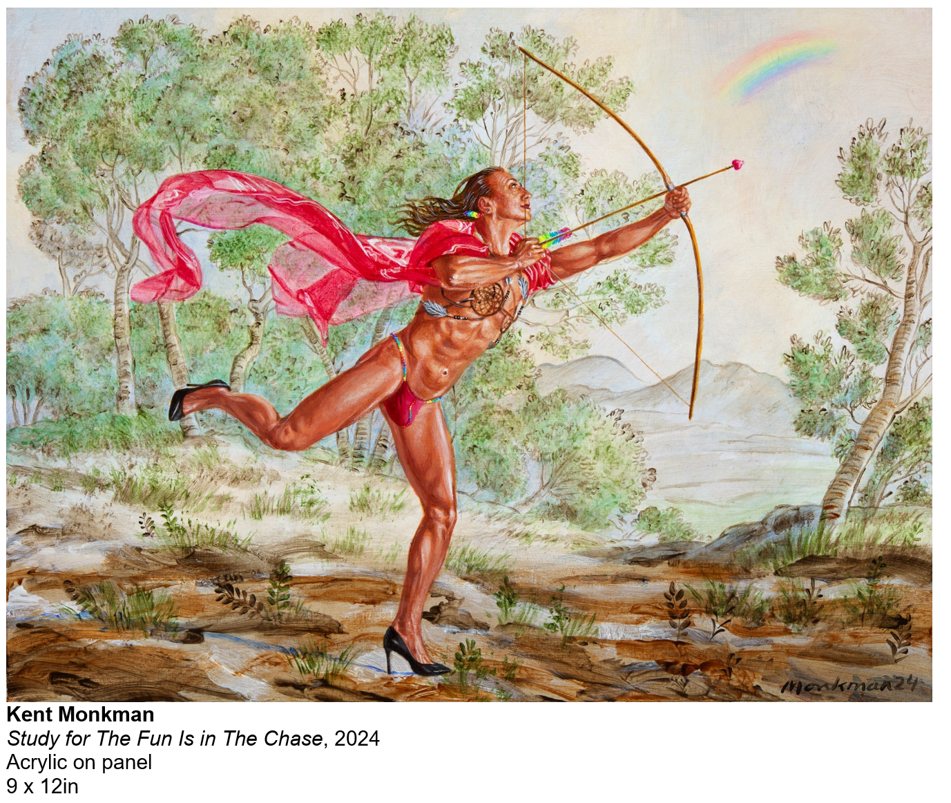 Kent Monkman's latest series, Portraits of a Legend, features his alter-ego, Miss Chief Eagle Testickle, in a new series of acrylic paintings. Donning her iconic dreamcatcher bra and high heels, Miss Chief roams Turtle Island's (North America) wilderness, hunting for love and communing with her kin, embodying myth and allure. With a painterly style reminiscent of eighteenth-century landscapes, Monkman's works capture the essence of studies by old masters in oil, ink, pen, and chalk, but suggest a time on Turtle Island long before European contact. While Monkman is known for his large history paintings interrogating Western art history-including The Met's monumental mistikôsiwak (Wooden Boat People) diptych, these intimate portraits offer a glimpse into Miss Chief as a legendary being amidst pristine landscapes, immersed in the unspoiled beauty of Turtle Island.
