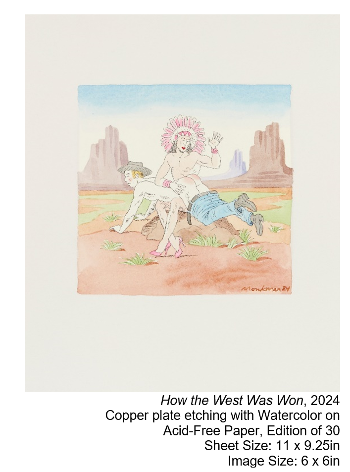 How the West Was Won, a copperplate etching hand-painted in watercolor and offered in a limited edition of 30, explores themes central to Monkman's work. In a practice spanning more than two decades, Monkman has challenged colonial power dynamics, often reversing the stereotypical roles of Indigenous-settler relationships in cheeky encounters set against majestic North American landscapes. Early examples of this include Ceci n'est pas une pipe, 2001, Heaven and Earth, 2001, and Cree Master 1, 2002. How the West Was Won engages these themes within the iconography of the American West where Monkman's alter ego, Miss Chief Eagle Testickle, dominates a cowboy against the backdrop of a desert, an open sky, and the imposing sandstone buttes of Monument Valley.