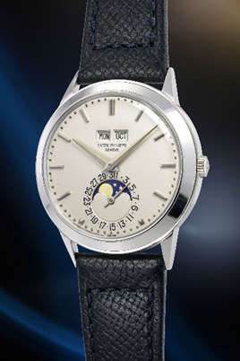 Phillips is also delighted to offer a Reference 3448 in white gold from 1973. Reference 3448 was launched in the early 1960’s and was Patek Philippe’s first perpetual calendar with an automatic movement. The watch kept the dial layout of its predecessors, namely the day and month indicated via appertures on the top part of the dial and the date and moonphase at 6 o’clock. White gold models like the present example are extremely rare as only 60 are known in the 20-year production span of the model.