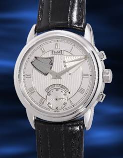 Launched in 1995, the Gouverneur collection marked Piaget's entry into the high-end watch market. François-Paul Journe, then a freelance movement designer, created the grand sonnerie wristwatch prototype, featuring the caliber 1996P with grande and petite sonnerie, minute repeater, and power reserve indicator. This masterpiece, with visible hammers on the dial, was unconventional for its time. Only six of the originally commissioned ten pieces were produced due to manufacturing complexity. This rare example, the third to appear at auction, is the only known white gold version with a silvered dial.