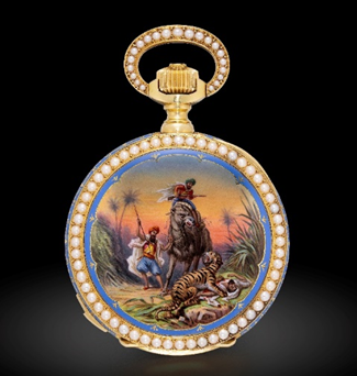 Another highlight from the curation of 19th Century timepieces made for the Chinese market is the Grande and Petite Sonnerie pocket watch, made 135 years ago, a rare masterpiece preserved in a private collection for nearly 30 years. Crafted by L. Vrard & Cie and decorated by P. Amédeé Champod, it features intricate hunting scenes and 154 pearls on its powder blue enamel case. Documented in "La Montre Chinoise," it was commissioned by a prominent Chinese collector in the late 19th century. The watch includes a white enamel dial with Louis XIV hands, Roman numerals, and gold decorations. Complete with its original mahogany presentation box, this exceptional piece is a significant collector's treasure.