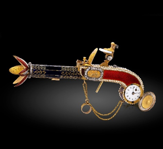 Flintlock pistol form perfume sprinkler watches are amongst the greatest rarities in automated precious objects, having fascinated the world for centuries with their romantic design. The present yellow gold pistol features intricate enamel work, pearls, diamonds, and a concealed watch with a manual key-wound movement that can be attributed to Moulinié, Bautte & Cie. Only a dozen surviving examples exist today, housed in prestigious collections like the Patek Philippe Museum and Topkapi Palace Museum. This well-preserved piece, accompanied by its original enamelled winding key manufactured by Ragnaud a Genève, offers collectors a unique opportunity to acquire a coveted object.