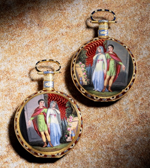 This exceptionally rare pair of ornate antique pocket watches by Swiss watchmaker Edouard Juvet represents the pinnacle of 19th-century decorative watchmaking. Crafted in Fleurier for the Chinese market, these timepieces feature Juvet's signature enamel work depicting the legend of Titus and Berenice. The demand in China for Swiss watches had exploded during the mid-19th century, and Juvet's exquisite enamel work was highly prized. Each watch contains a highly praised key-wound movement, with intricate decorations and pristine enamel dials. Accompanied by their original leather presentation box, these well-preserved watches are a testament to Juvet's legacy and the cultural exchange of the era, making them prized relics for collectors.