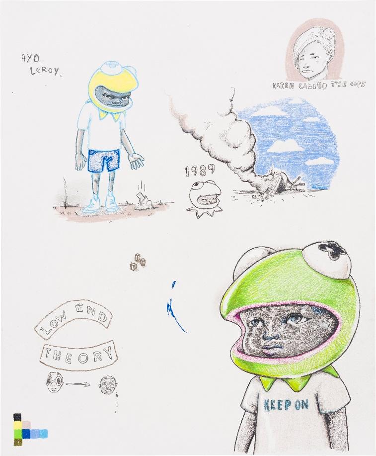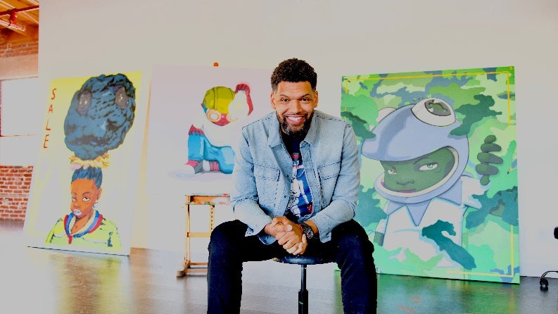 Hebru Brantley creates narrative-driven work revolving around his conceptualized iconic characters which are utilized to address complex ideas around nostalgia, the mental psyche, power, and hope. The color palettes, pop-art motifs, and characters themselves create accessibility around Brantley’s layered and multifaceted beliefs. Majorly influenced by the South Side of Chicago’s Afro Cobra movement in the 1960s and 70s, Brantley uses the lineage of mural and graffiti work as a frame to explore his inquiries. Brantley applies a plethora of mediums from oil, acrylic, watercolor and spray paint to non-traditional mediums such as coffee and tea. Brantley’s work challenges the traditional view of the hero or protagonist and his work insists on a contemporary and distinct narrative that shapes and impacts the viewer’s gaze. Find out more about the artist: https://www.hebrubrantley.com/ https://www.instagram.com/hebrubrantley/