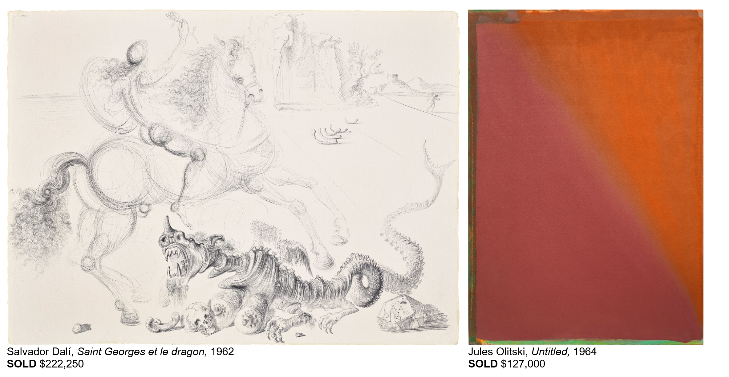 Nina Piro, Specialist, Associate Vice President, said, “Our second annual July auction of Modern & Contemporary Art brought together a wonderful selection of works that spanned the breadth of artistic movements from the past century. Salvador Dalí’s work on paper, Saint Georges et le dragons, led the auction at $222,250, while Marc Chagall’s Les amoureux sur le divan nearly doubled its estimate at $95,250. Examples by Alex Katz performed exceptionally well, with all three of his works figuring prominently in the top ten. The group was led by Nine Women 6 at $114,300, which sold against an estimate of $60,000-80,000. Chantal Joffe’s Ivana also saw spirited bidding with the work ultimately realizing more than five times its estimate at $38,100. We wish our community of collectors a wonderful summer and remind those in New York to visit 432 Park Avenue for our upcoming exhibition Lynne Drexler's Garden: Works from the 1950s-1990s, opening on 25 July.”