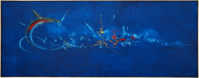 Georges Mathieu stands as a defining force of post‑war abstraction, credited with pioneering the movement he named “lyrical abstraction.” Rejecting geometric rigidity, he championed pure, unrestrained gesture — sweeping calligraphic lines executed with long brushes or paint applied directly from the tube in bursts of immediacy and velocity. Celebrated through major retrospectives and public commissions in the 1960s–70s, Mathieu expanded his influence into tapestry, sculpture, architecture, and design. This monumental canvas offered in this season’s Evening Sale, created on commission for Air France and unveiled at an exhibition inaugurated by French cultural minister André Malraux. It encapsulates his philosophy of “no preconceived form” and the ecstatic, Dionysian energy that defined his most iconic works.