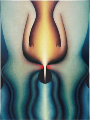Loie Hollowell’s Hung (Down) is a pivotal work that showcases her distinctive fusion of geometric abstraction and corporeal symbolism. It uses vibrant colour and symmetrical form to evoke themes of femininity, sexuality, and political tension—particularly in response to the 2016 U.S. presidential election and the media’s treatment of Hillary Clinton. Presented in her sold-out solo show Mother Tongue, the painting marks the beginning of her hybrid approach, blending painting with sculptural elements. It also draws on the legacy of pioneering female artists like Agnes Pelton and Georgia O’Keeffe, incorporating spiritual symbolism and sensual forms that echo their iconic visual languages.