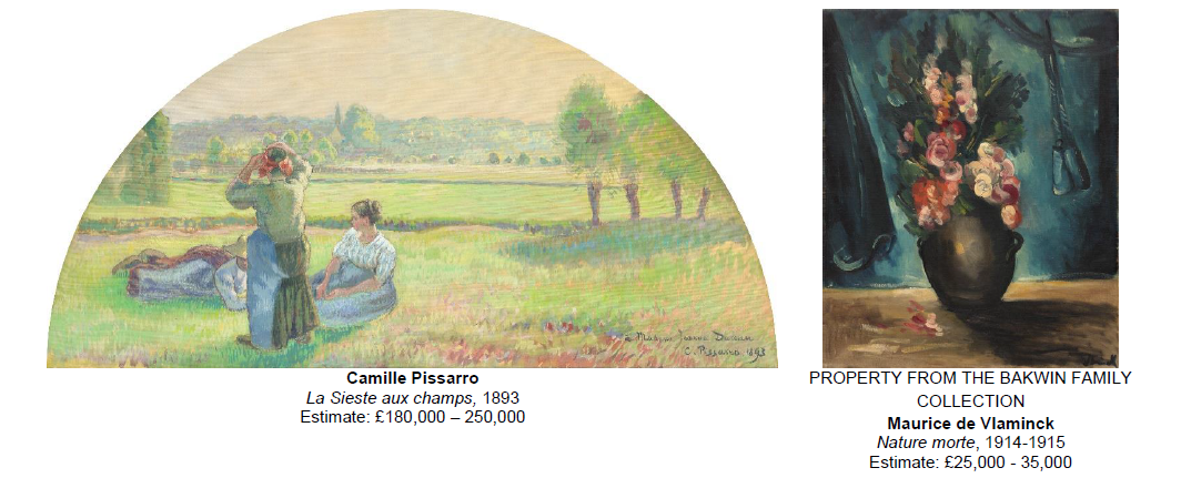 Among the Modern highlights of the sale is La Sieste aux champs, painted by Camille Pissarro. This painting was created as a wedding gift for Jeanne Durand-Ruel, daughter of Pissarro’s dealer Paul Durand-Ruel, to celebrate her marriage to Albert Dureau in September 1893. Signed by Pissarro and dedicated to Jeanne Durand-Ruel, this work is one of 70 fan-shaped paintings the artist produced in the late 1800s. Other notable works featured in the Modern section of the sale include a landscape by André Derain, once part of notable collector Erik Estorick’s collection and a still life by Maurice de Vlaminck from the Bakwin Family collection