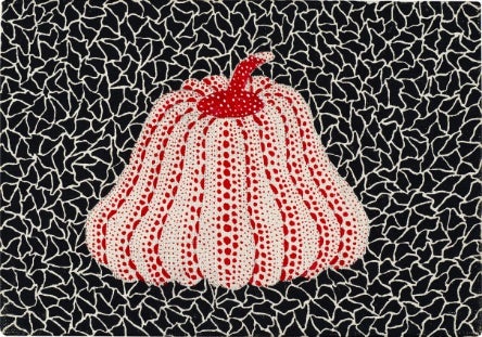 Yayoi Kusama’s many acrylic paintings of pumpkins rank among her best-selling works. The present 1982 work offered in this season’s Day Sale shows her opposing and harmonising three of the most vivid, personally resonant, and publicly recognisable motifs of her life in an especially striking manner. It lacks the warm yellow tones familiar to many of the other entries, instead rendering the vegetable in a violent shade of red against white, contrasting with both the sharp angles of the infinity net surrounding it and the ominous black space behind both.