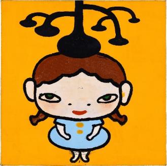 Yoshitomo Nara’s O.T (N.G) features the iconic Nara girl wearing a baby blue Alice in Wonderland style dress, the same as in three of the artist's top ten results at auction. The painting assembles some of the most desirable Nara girl traits: a full body portrait, almond shaped downturned eyes, a non-descript background of colour built up from numerous layers of paint. The girl wearing a black crown that looks like sprouting seeds, which echoed the motif that Nara has explored numerous times throughout his oeuvre, bringing to mind themes such as progress, evolving, the natural world and rebirth.