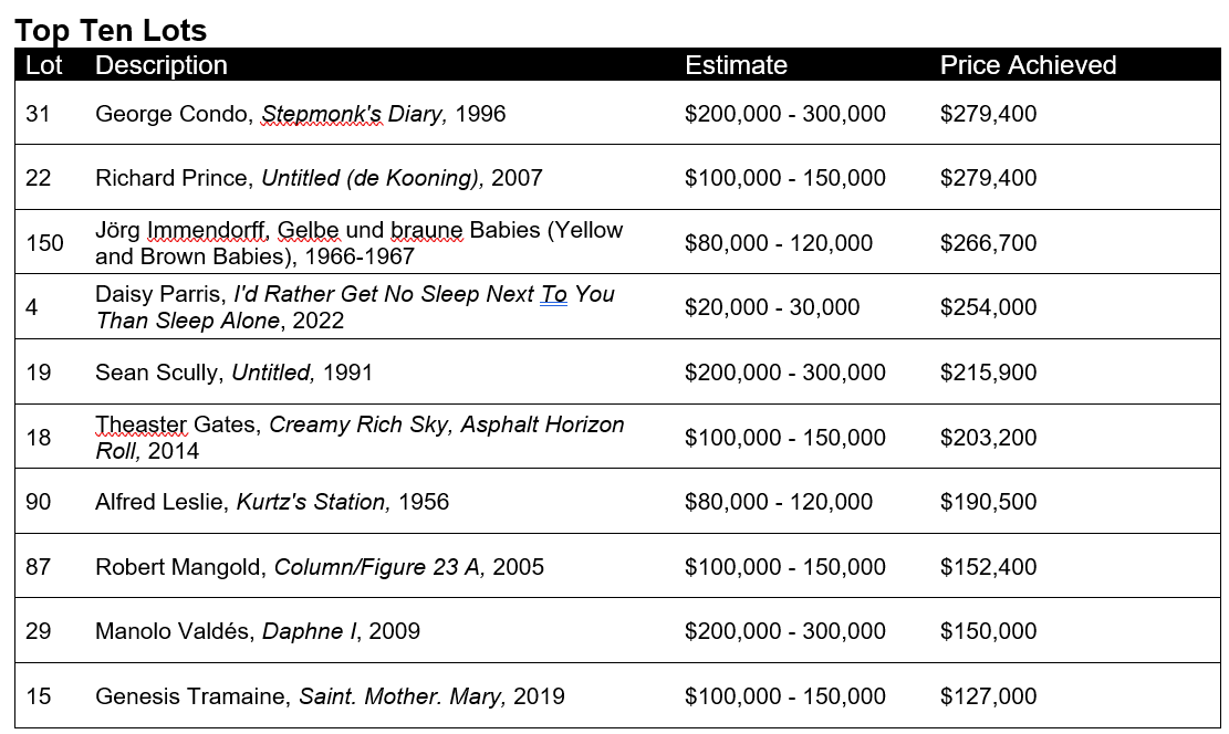 Avery Semjen, Specialist, Head of New Now New York, said, “The results from today’s New Now: Modern & Contemporary Art auction – the first live sale of the season here in New York – confirm a solid middle market as we begin the fall season. We saw enthusiastic participation from six continents, with great depth of bidding for works spanning the art historical canon. From Bill Traylor’s Untitled (Woman, Green Blouse, Black Bag), which soared past its estimate to $38,100, to Sara Anstis’ tremendous auction debut at $53,340, to Daisy Parris’ I'd Rather Get No Sleep Next To You Than Sleep Alone, which set a new artist record at over twelve times its estimate, it was wonderful to see demand for exceptional works. We are also proud to have set records for Peter Cain and Moira Dryer, among others, in today’s auction. We welcome our collectors to bid in our online-only auction, open through 3 October, and also look forward to continuing the momentum through our London Modern & Contemporary Art sales in October.”