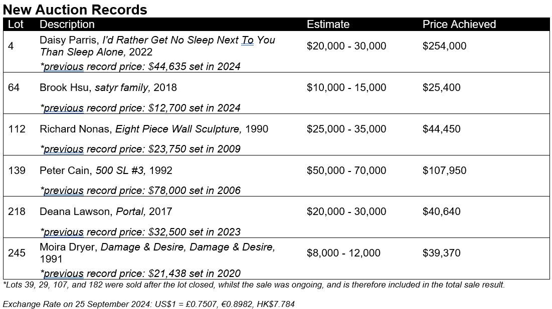 New Auction Records Set for Daisy Parris, Peter Cain, and Moira Dryer, Among Others