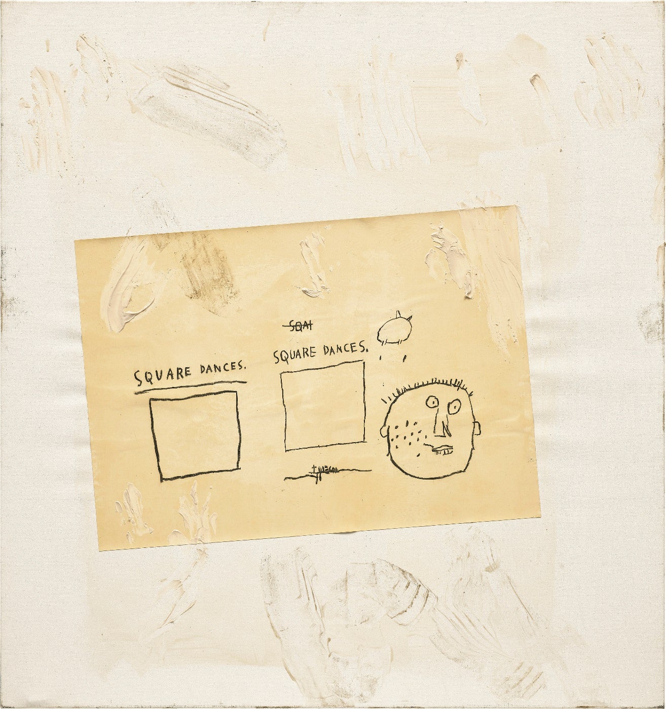 The sale is led by Jean-Michel Basquiat’s Feng Yao from 1983. Executed just a year before Basquiat became the youngest artist ever included in the Whitney Biennale, Feng Yao exemplifies the artist’s fusion of his distinctive visual symbols and textual elements. Measuring five feet in height and width, the work centers a paper collage on a primed white canvas, marked by Basquiat's handprints, underscoring his physical engagement with the piece. Central to the collage are drawings and inscriptions familiar to Basquiat’s practice, including the phrase "SQUARE DANCES," reflecting Basquiat's spontaneous and energetic creative process, as well as a deep engagement with music and dance.