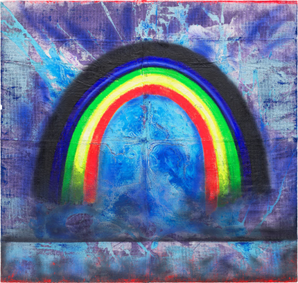 A promise of sunshine after the rain by Vaughn Spann exemplifies the artist's deep engagement with materiality and color, using both to convey messages about race and power. Painted in 2021 as part of his Rainbow Paintings series, the work reflects on the tragic death of Trayvon Martin, with the rainbow symbolizing both the artificial colors of the candy Martin carried and a hopeful promise of better times. Spann’s inclusion of a black arc within the traditionally joyful rainbow speaks to the complexities of Black identity in America. Painted on terry cloth, the piece is also a nod to personal memories of folding towels with his grandmother, blending personal history with broader social commentary. Spann’s choice of medium combined with his altered depiction of a rainbow creates a work that invites myriad interpretations but ultimately stands alone as a poignant homage and hopeful emblem for the future.