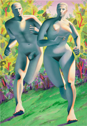 Painted in 2018, Robin F. Williams' Joggers presents two stylized, larger-than-life figures set against a vibrant landscape, blending humor with a nod to art history. The six-foot-tall figures, rendered in a muted gray, contrast sharply with the electric greens, pinks, and oranges of their lush surroundings, creating an otherworldly effect. Williams describes her figures as "zombie nudes," reimagining classical and pop culture representations of the nude. With chiseled forms reminiscent of Baroque sculptures and an outdoor setting akin to Impressionist works by Cezanne, Joggers subverts traditional depictions of nudes. By including both male and female figures in motion, Williams challenges the historical objectification of the female nude and repositions the figures as active, rejecting the viewer’s gaze. This playful and thought-provoking work intertwines classical themes with contemporary commentary, creating a modern Garden of Eden.
