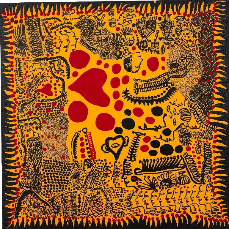 Other highlights include Yayoi Kusama’s I Who Sing in Celebration of Humanity, which contains all of Kusama’s signature motifs tracing to the beginning of her career: pumpkins, hearts, faces, disembodied eyes, etc. Prominently exhibited internationally in London and Brisbane, the present work is a pioneering work of Yayoi Kusama’s large scale colourful square canvas series named My Eternal Soul which began in 2009, the same year the present work was executed.