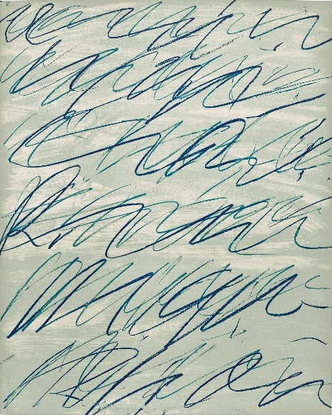 Gerhard Richter’s Goldberg-Variationen (Goldberg Variations) (1984) transforms a phonograph record of Glenn Gould’s 1982 The Goldberg Variations into a vibrant abstract composition, testament to Richter’s fascination with materiality and music. Swathes of cobalt blue and bright yellow paint merge and contrast, with glimpses of the record’s black surface emerging beneath.