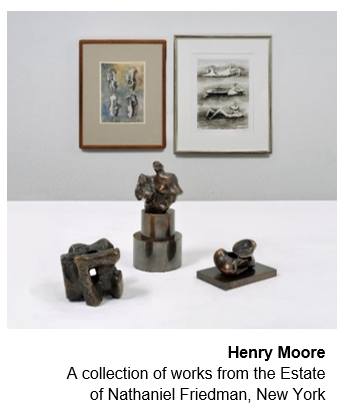 Bolstering highlights from the Modern period is a selection of 18 lots across the Evening and Day Editions Sales from the estate of Professor Nathaniel Friedman, a mathematician, educator, and pioneer in the international art and math movement. Friedman used his discerning eye for mathematical forms to build a distinctive collection of artworks, favoring dynamic sculptures and prints that blurred the lines between figuration and abstraction, positive and negative space. Among the selection are 15 lots by Henry Moore, who knew Friedman personally and shared his nuanced understanding of spatial relationships, which are evident in the three bronze maquettes on offer and his beautifully rendered, unique drawing, Bone Forms.