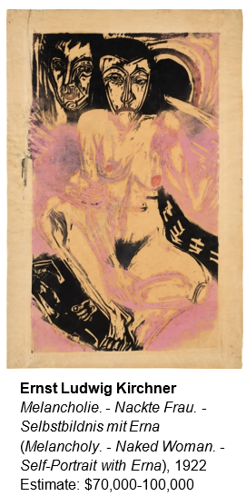 Some of the earliest highlights in the sale include the Norwegian artist Edvard Munch’s 1902 lithograph, Die Sünde (Woman with Red Hair and Green Eyes, The Sin). Considered an undisputed master of printmaking, Munch possessed a keen interest in technical experimentation, and The Sin is considered one of his largest and most important graphic works of art – standing out as a strong example of the artist’s use of color to enhance the emotional potency of his subject. Here, Munch conjures the popular fin-de-siècle theme of woman-as-temptress, femme fatale, with her intense green eyes, and bare torso and breasts flanked by tousled red tresses – a seducer and betrayer of men.