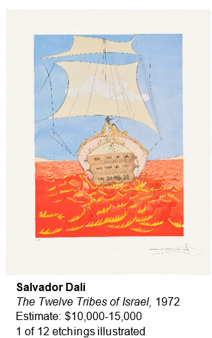 The October auction features 21 lots from the collection of Carole and Alex Rosenberg, which represent the couple’s outstanding collection of graphic art, a reflection of their decades-long engagement with the New York art world and living artists. In 1969, Mr. Rosenberg began publishing artists’ prints under the name Transworld Art, where Carole joined as an associate editor in 1973, publishing more than 700 editions by over 60 artists. The collection reifies their personal and professional relationships with great names in Modern and Contemporary art, including Alexander Calder, Romare Bearden, Salvador Dalí, and Willem de Kooning.