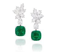 The finest Colombian emeralds exhibit a richly saturated and homogeneous bluish green hue, and often possess a variety of internal inclusions, or fingerprints of nature, due to the delicate balance of their formation and the demanding methods taken to obtain these precious gems. Untreated examples with high clarity are thus extremely rare and sought after. This season, Phillips presents a spectacular 16.47 carat cushion-shaped Colombian emerald and diamond ring, by Van Cleef & Arpels, circa 1965 and a pair of Colombian emerald and diamond earrings by Harry Winston, with both emeralds possessing the exemplary qualities of the finest Colombian gemstones – each free from oil treatment, and with a highly desirable intense colour and a well-proportioned cut.