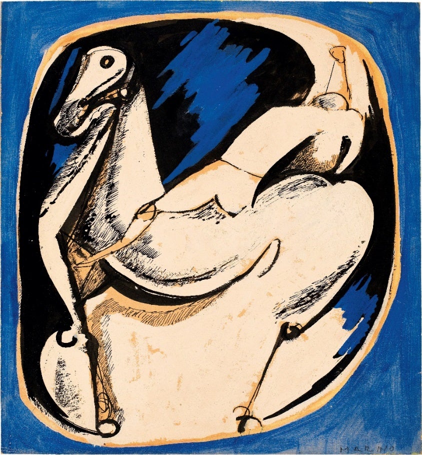 Inspired by Giacometti and the Surrealist circle in Paris around 1930, Henry Moore also began to further develop his drawing practice. Often drawing from life, he was particularly interested in the human form in relation to the natural world. Moore was an exceptional draughtsman, handling shape and form with the same skill as he did in clay. He also worked much more quickly and fluidly on paper and throughout his career, Moore made over 7,000 drawings. He took inspiration from his lived experiences in urban surroundings and natural landscapes. Reminiscent of his haunting ‘Shelter Drawings’ created between 1940-41, following the devastating impacts of the second world war bombing in London, Odysseus in the Naiads' Cave (1944) depicts similar sculptural, reclining human forms entombed within enclosed spaces.