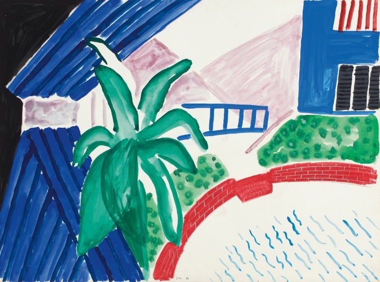 Leading the group are David Hockney’s House Palm and Pool, two paintings on paper from 1982, which exude the California Cool for which the artist is so renowned. Created soon after Hockney bought his Hollywood Hills house, each presents a subtly different vignette of the artist’s lush backyard, rendered with the vibrant color and distilled lines that call Henri Matisse to mind. These works capture Hockney’s love affair with the city of Los Angeles, best epitomized in the subject matter of the swimming pool ever since his first visit in the 1960s. Ten years after completing the iconic painting Portrait of an Artist (Pool with Two Figures) in 1972, Hockney’s fascination with the motif continued—here notably reveling in the immediacy of painting with gouache on paper. As much as these works represent a continuation of Hockney’s early work, they also mark the important inflection point ushered in by his purchase of his Hollywood Hills home, which would become a favored subject across the decades. With these works, Hockney presents us with intimate snapshots of the calm yet vibrantly painted sanctuary he was able to build in the sprawling metropolis of Los Angeles. The House Palm and Pool series presents similar views of Hockney’s residence captured by the artist from a slightly elevated position en plein air from his terrace. The works brilliantly capture our everyday experience of seeing, where the eye wanders and the body shifts, gaining different vantages of the same scene from one moment to the next.