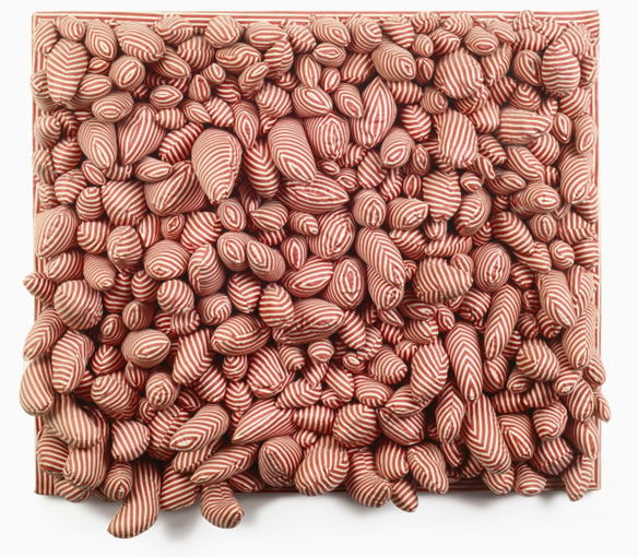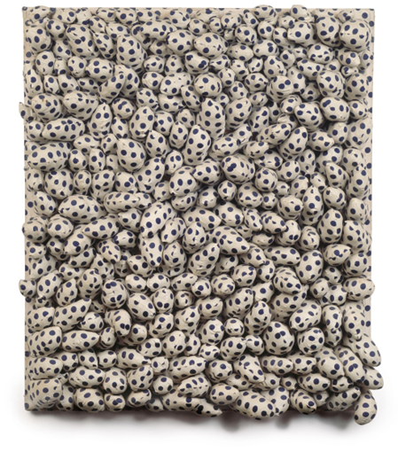 Kusama’s signature soft-sculptural shape grew out of her development of the infinity net motif in the late 1950s and early 1960s. The undulation of the two-dimensional infinity nets expands into three dimensions in the tuberous shapes of Red Stripes and Blue Spots, as the eye scans across the varying heights and widths of the forms. Blue Spots and Red Stripes are some of the earliest extant examples of the artist’s soft-sculpture motif of tuberous forms that smother the surface. The works are concentrated onto squared boards hung on the wall like paintings while the soft, cloth-covered striped and spotted forms reach out towards the viewer. Red Stripes brings together perhaps her most iconic color combination of red and white, while Blue Spots provides an early example of the polka dots which would come to define Kusama’s career. Although made while she worked in Europe, there is a level of vulnerability in Kusama’s work, as seen in Red Stripes and Blue Spots, that sets her apart from her European contemporaries. She has expressed repeatedly throughout her career that artmaking is a life-saving practice which allows her to process and express the trauma and mental illness she has experienced. The emotional vulnerability of this practice makes it all the more approachable, and relatable, even sixty years on.