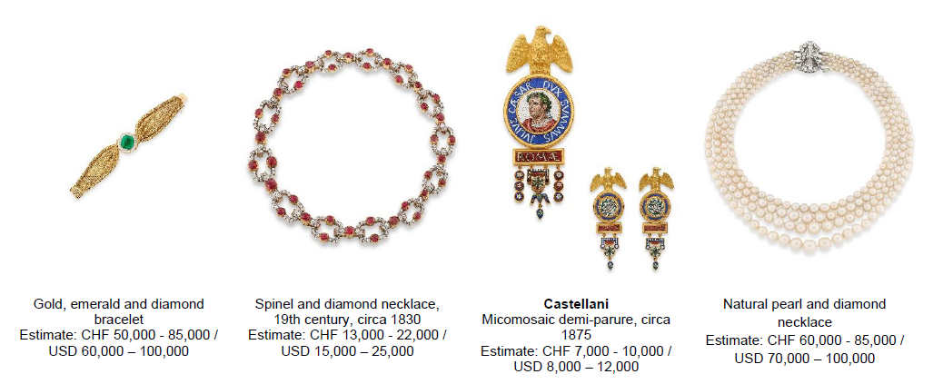 Among the highlights of jewels with remarkable provenance is a gold, emerald, and diamond bracelet featuring an 11.39-carat emerald, originally part of Adrienne de Morgan de Belloy's wedding basket when she married Pierre de Berny in 1893, and later re-mounted in 1959 on a gold bracelet. A 19th-century spinel and diamond necklace, believed to have been gifted by King George IV to his mistress, Elizabeth Conyngham, Marchioness Conyngham, will also be on offer.