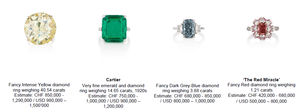 Additional highlights include a 40.54-carat fancy intense yellow diamond ring with VS1 clarity, and a Cartier emerald and diamond ring, showcasing a 14.65-carat Colombian emerald set in a vintage Cartier mount from the 1920s. Also featured is a 3.88-carat fancy dark grey-blue diamond ring with exceptional polish.