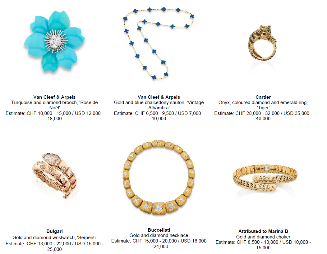 Additional highlights of the sale include iconic and classic pieces from prestigious jewellery houses. Van Cleef & Arpels' timeless "Rose de Noël" brooches and ear clips exude floral elegance, alongside their celebrated Alhambra design with signature four-leaf clover motif. Cartier’s bold and striking Tiger ring exemplifies the house’s fascination with fierce animal motifs. Further intricate craftsmanship can be seen in Bulgari’s bold Serpenti wristwatch design and Buccellati's exquisite gold and diamond necklace. Completing the collection is a contemporary statement choker attributed to Marina B.