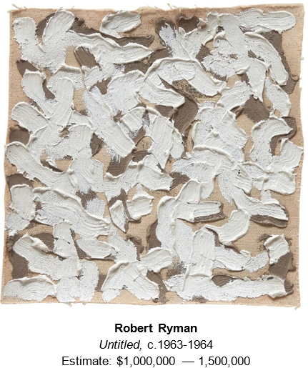A further highlight of the Modern & Contemporary Art Evening Sale in New York is Robert Ryman’s Untitled, c. 1963-1964. Exemplifying his early exploration of painting's core elements —material, surface, and process— Untitled marked a shift toward abstract approaches in Ryman’s practice. The unstretched canvas and textured layers of white paint, subtly revealing muted taupe, highlight the artist’s focus on the interaction between paint and light. His use of the square format allowed him to concentrate on the materiality of painting, a technique influenced by his background in jazz improvisation. Untitled was showcased in a major retrospective celebrating Ryman's 70th birthday, which opened at the Haus der Kunst in Munich in 2000 and traveled to the Kunstmuseum Bonn in 2001. Comparable works from this formative period in Ryman’s career reside in the permanent collections of respected institutions such as the Museum of Modern Art, New York, and the Dia Art Foundation, Beacon.