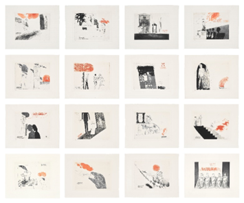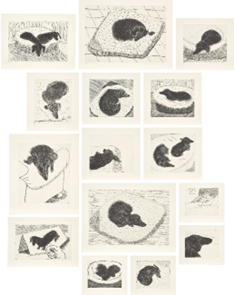 Bookending Hockney’s first etching, A Rake’s Progress, is Hockney’s last major foray into etching with Dog Wall. Created in 1998, Dog Wall is a large-scale homage to the artist’s two beloved dachshunds: Stanley and Little Boodgie. Portraying the two dachshunds lounging in various positions, both together, and individually, Dog Wall attests to Hockney’s adoration of Stanley and Little Boodgie while simultaneously illustrating the brilliance of his draftsmanship.