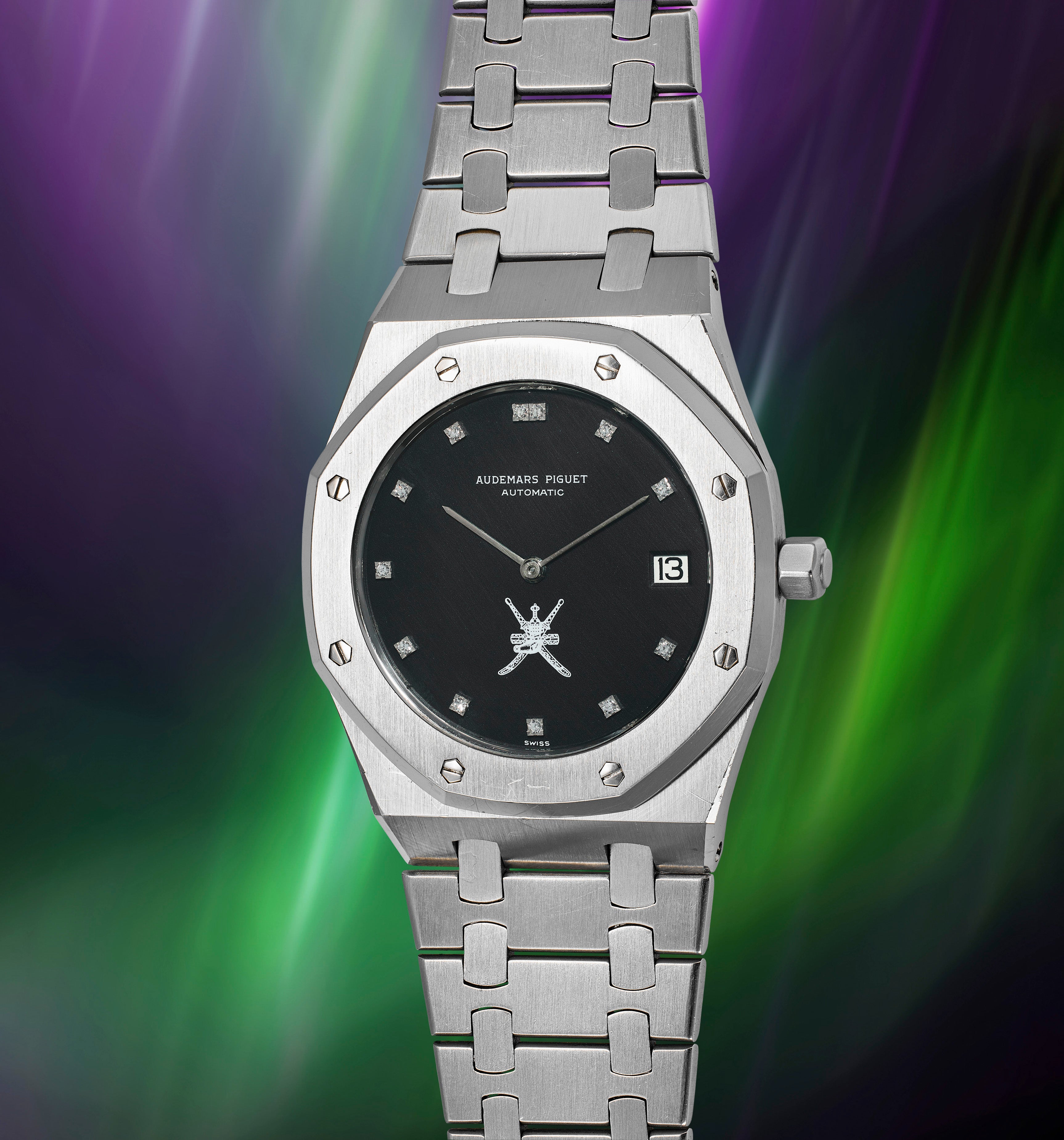Distinguished by its black dial, devoid of the customary tapisserie motif but embellished with refined diamond markers and prominently displaying the royal "Khanjar" daggers at 6 o’clock, the present reference 5402 stands apart from regular production models. Records indicate that in the spring of 1973, Audemars Piguet ordered a batch of six dials without the tapisserie motif, featuring diamond-set indexes and an emblem at 6 o'clock. His Majesty Sultan Qaboos bin Said al Said of Oman frequently commissioned timepieces from esteemed manufactures to bestow upon loyal friends and foreign dignitaries. Assuming the throne on 23 July 1970, this makes the present watch likely one of the earliest gifts bestowed during his reign.