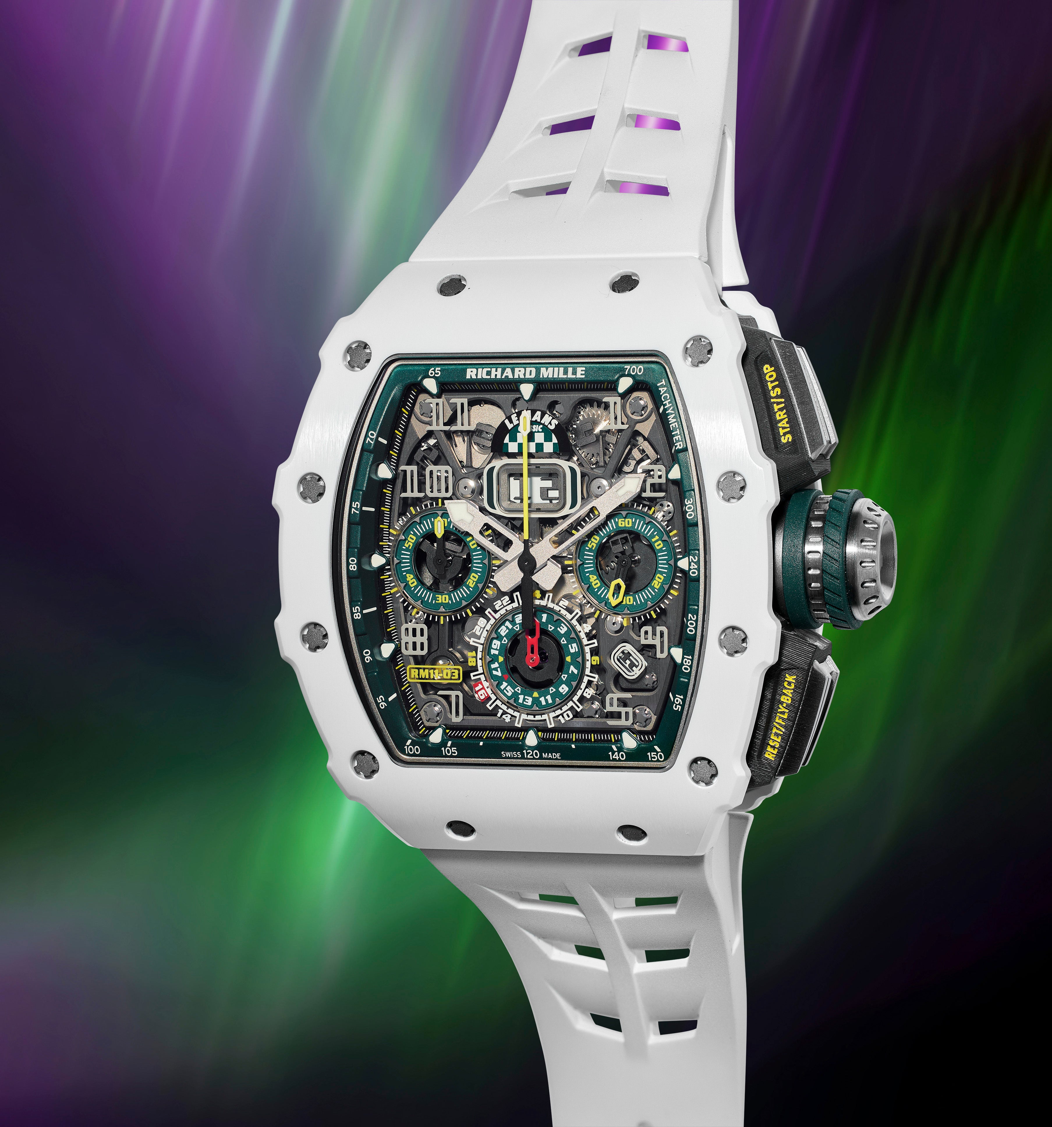 The present RM11-03 is a rare variant of the reference, being one of a limited edition of 150 pieces made specially for Le Mans. Presented in like-new condition complete with all its original accessories, this watch exemplifies a passion for motorsport and technological innovation.