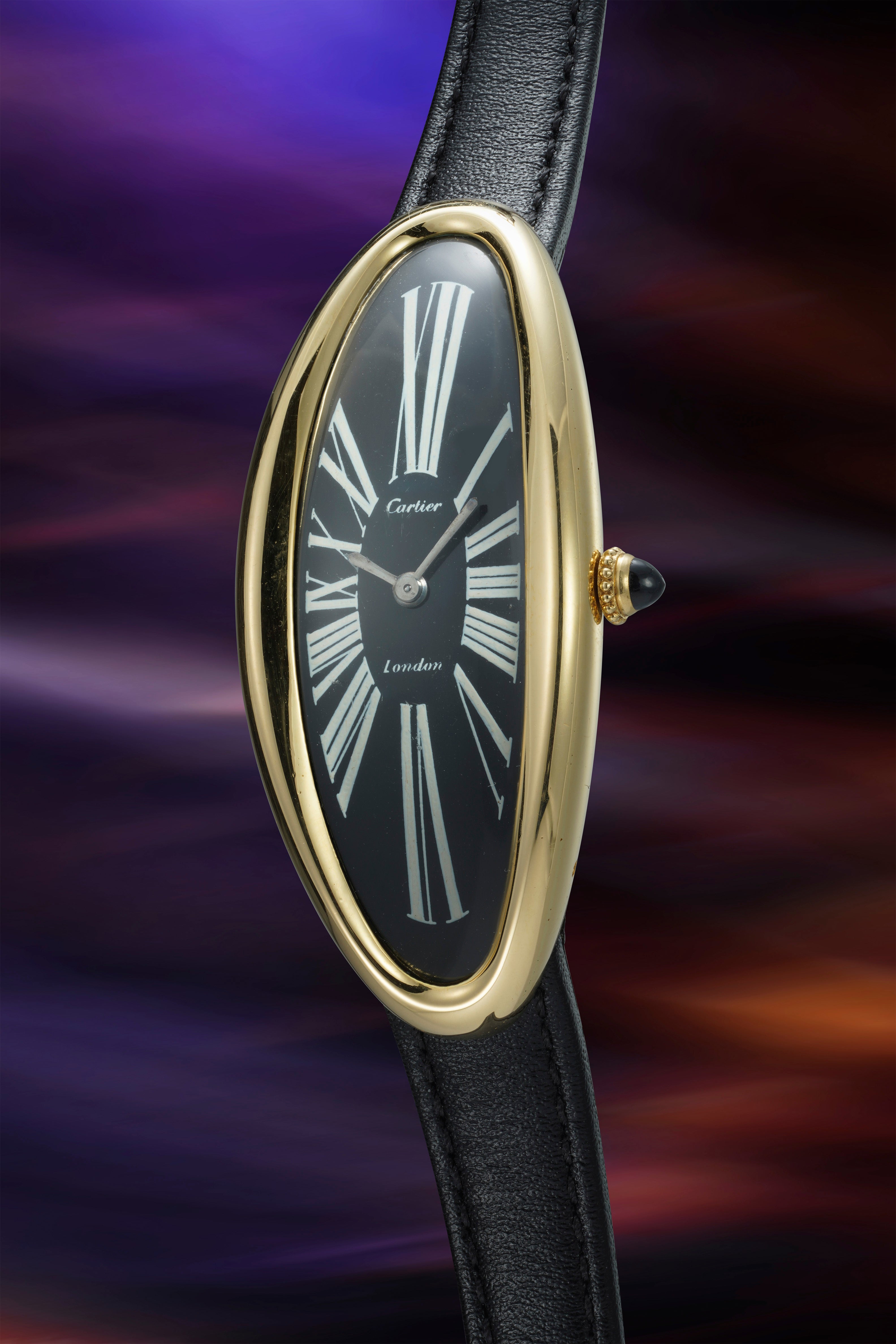 Rendered even more collectible due to its extraordinary black/blue dial, it is one of only two known examples with this dial configuration, with the two watches being only one serial number apart. While both the case and clasp are numbered 9180, the clasp is also stamped with Cartier hallmarks dated 1969 and ‘JC’, which stands for Jacques Cartier. The present lot was purchased at auction in 1990 and has remained in the same collection since its acquisition.