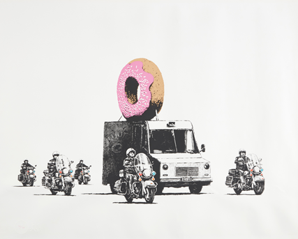 Banksy’s classically irreverent 2009 screenprint Donut (Strawberry) was released shortly after the original painting of the same subject matter was completed. This differentiates the work from many of his other prints that were completed based on images that the artist originally stenciled on walls. The screenprint was released as an edition of 299, a smaller edition size when compared to many of his other images printed in much larger runs of up to 600. The edition size is a nod to the donut super chain Krispy Kreme’s closing of 299 stores due to financial trouble in 2007. This iconic image is signed, accompanied by its original Certificate of Authenticity from Pest Control and offers a more colorful flavor than his Donut (Chocolate) version depicting the same scene.