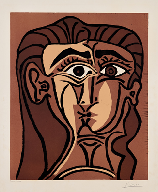 Portrait de Jacqueline de face II (Portrait of Jacqueline from the Front II), 1962 depicts Jacqueline Roque, whom Picasso met when she was 26 and he was 72; they married, making her his second and last wife. Married 11 years until his death in 1973, Picasso drew her hundreds of times, more than any other lover, and this large linoleum cut is one of the most important graphic images he created. Additionally, Portrait de Jacqueline de face II (Portrait of Jacqueline from the Front II) is one of Picasso’s most important linocuts and considered one of the key images of Jacqueline. Phillips holds the highest price achieved for a linocut by Picasso from the 2019 sale of Portrait de jeune fille, d’après Cranach le Jeune (Portrait of a Young Woman, After Cranach the Younger), 1958.