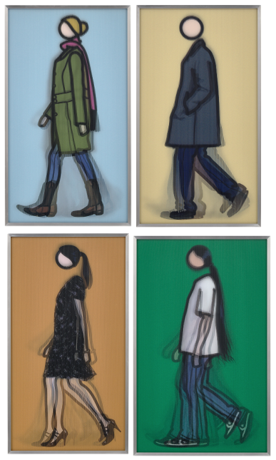 Julian Opie is a preeminent artist of the New British Sculpture Movement, pushing the boundaries of traditional artistic practice through his exploration of and experimentation with a variety of media. In Siân Walking; Jeremy Walking in Coat; Verity Walking; and Kris Walking, Opie takes advantage of lenticular printing to produce the illusion of depth and movement. Each of Opie’s lenticular acrylic panels include approximately twenty images that appear to transform into one another to generate a figure walking endlessly on a loop. Thus, when a viewer walks past these works of art, their movement is mimicked in the print.