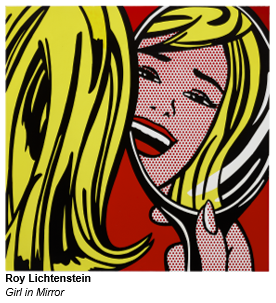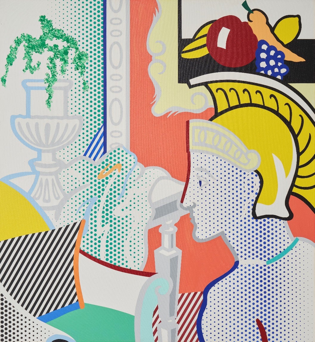 Ajax, Greek hero from the Trojan War, stands in the very forefront of his canvas. He is instantly recognized from his classicized profile, bare chest, and Greek war helmet. A master of mixing the high and the low arts, Lichtenstein juxtaposes simple modern furnishings in the same picture plain as Ajax. Furthermore, above Ajax’s head, he has included a small still-life within a still-life. The framed painting of fruit recalls the highly graphic and iconic print ads that Lichtenstein was so know for in his early career.