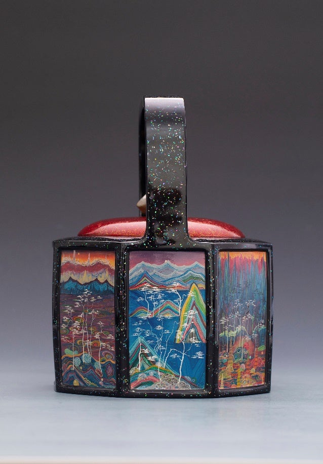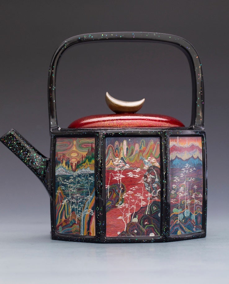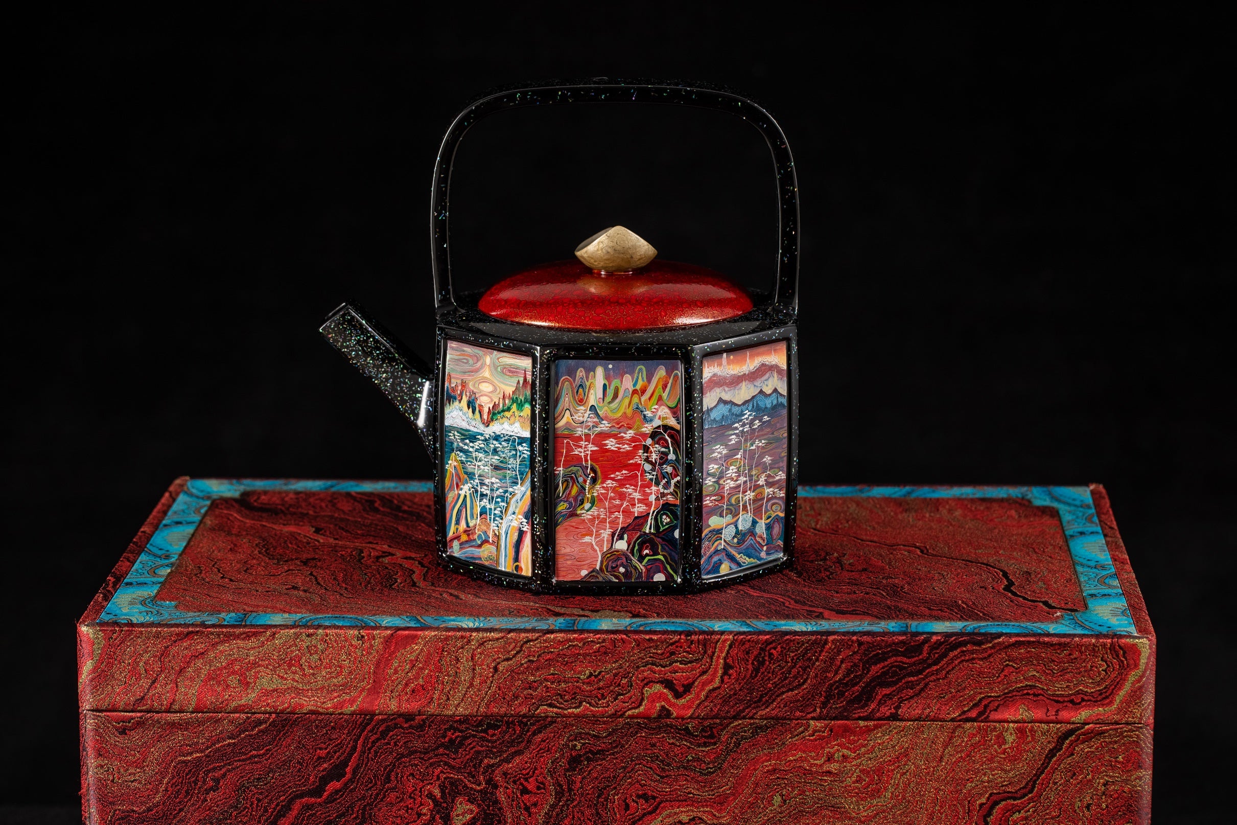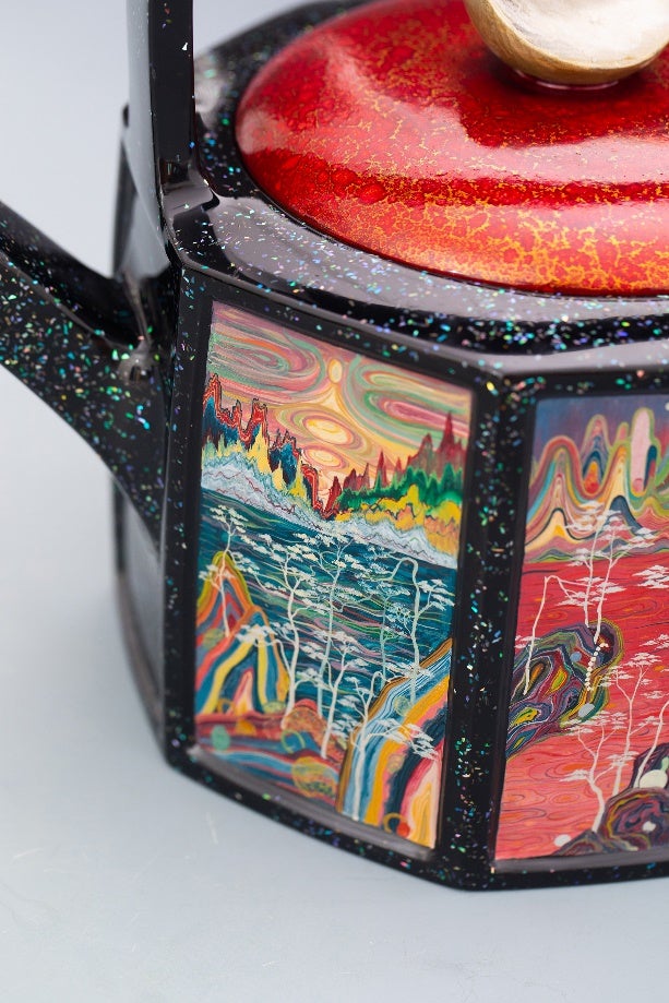 Seven Treasure Pines captures and embodies Huang’s deep fascination for Tibetan Buddhism. From left to right, each panel represents one of the Treasures of Buddhism: coral, agate, pearl, gold, silver, tridacna stone, and azurite, exploring the immensity of the universe. The teapot sculpture is octagonal to showcase the integrity of the painting, and it symbolizes eight planets in the solar system by being divided into eight parts. The octagonal body of the teapot serves as a window frame of the view, which appears to be an outdoor scenery or an installation. The lid knob and lid are composed to represent "the sun" and "the moon," resembling the rise and fall of the sun and the moon, echoing the concept of heaven and earth, expressing the vibrant circle of life. The teapot handle is made using the lug technique, enhancing its upward feel. It is embellished with mother-of-pearl inlay, creating a shimmering effect against the lacquer background reminiscent of stars in the night sky. Lacquer is a natural resin extracted from lacquer trees with a long history in Chinese culture as intangible cultural heritage. Crafting exquisite lacquerware involves numerous complex processes; replicating Huang Yuxing’s Seven Treasure Pines requires hundreds of layers of colouring techniques. The purple clay used to make the sculpture is the dark reddish-purple clay, known as Dicaoqing, which comes from Ding Shu Township in Yixing, Jiangsu Province.