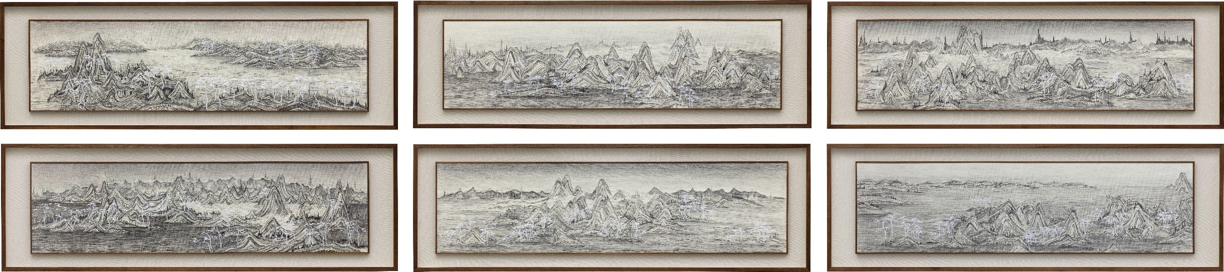 A Thousand Miles of Rivers and Mountains is a work by the Northern Song dynasty court painter Wang Ximeng, now housed in the Palace Museum in Beijing. The artwork depicts the beautiful mountains and rivers of the Northern Song dynasty and is regarded as a masterpiece in traditional Chinese landscape painting. Highlighted in the exhibition is Composition: A Thousand Miles of Rivers and Mountains 1-6 which presents Huang Yuxing's reinterpretation of A Thousand Miles of Rivers and Mountains. He deconstructed the long scroll into six sections, removed the colours typically found in traditional landscape paintings, and presented his magnificent vision of mountains and rivers through pure composition. The six segments display completely different wide-ranging landscapes. At the same time, the use of simple black-and-white tones echoes the traditional Chinese painting concept of "ink divided into five categories," reconstructing the artistic conception of rivers and mountains through a visual experience based on black, white, and gray.