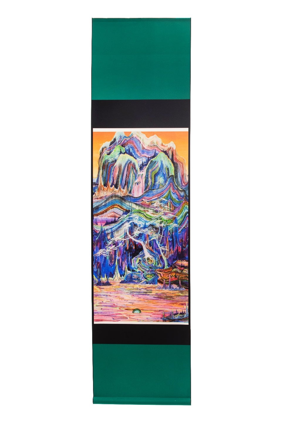 For this project in Hong Kong, Huang Yuxing created Endless miles of mountains and streams with a total of 66 editions. The composition of the work is based on his painting Nine Dragons. The imagery corresponds to the Northern Song Dynasty artist Fan Kuan's Travelers Among Mountains and Streams currently held in the Palace Museum in Taipei. The work adopts the typical panoramic composition of Northern Song landscape painting. Distant mountain peaks stand tall against the sky. In the middle, a prominent pine tree appears as a personified or anthropomorphized element in the artist's brushwork, making the landscape painting livelier and fuller of charm. Like Travelers Among Mountains and Streams, Endless miles of mountains and streams follows the classic 2:1 aspect ratio, and it is mounted as a vertical hanging scroll.